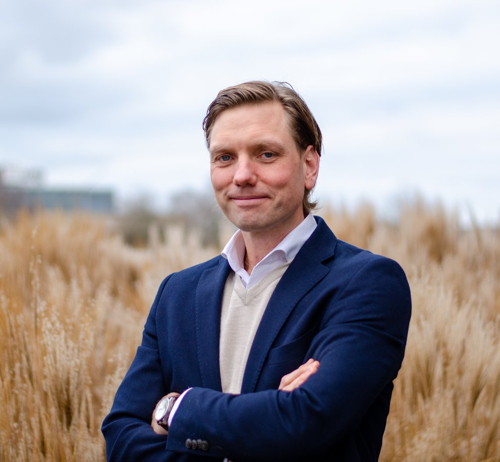 Michiel van den Berg, CEO van Eteck buiten voor een veld met hoog droog gras