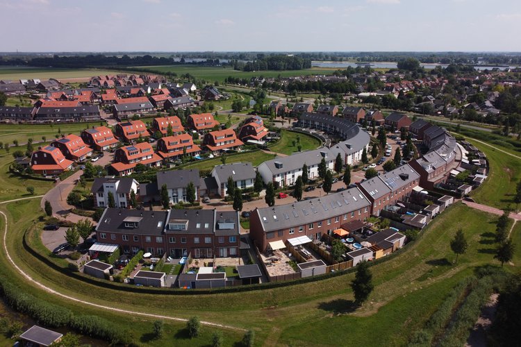 Bovenaanzicht van project Hoog Dalem in Gorinchem twee woonwijken gebouwd in een spiraalvorm met tuinen die uitkijken op de weilanden Bovenaanzicht van project Hoog Dalem in Gorinchem twee woonwijken gebouwd in een spiraalvorm met tuinen die uitkijken op de weilanden